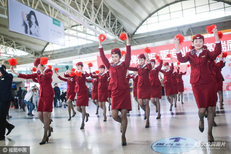 2017年2月10日,山東航空公司(山航)魯雁乘務(wù)組在青島國際機(jī)場候機(jī)大廳舉行“元宵節(jié)同樂匯”活動,以悉心編排的精彩歌舞節(jié)目,為旅客送去元宵節(jié)的祝福,點亮春運旅途。