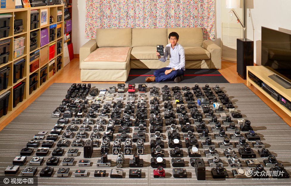 騰空整個(gè)客廳,整理40個(gè)收納箱,鋪1萬張135底片面積大小的灰色地毯,擺滿自己收藏的210臺(tái)古老相機(jī),就為給它們拍張全家福。2017年的這個(gè)春節(jié)成都小伙子李康足不出戶,就搗騰這一件事。