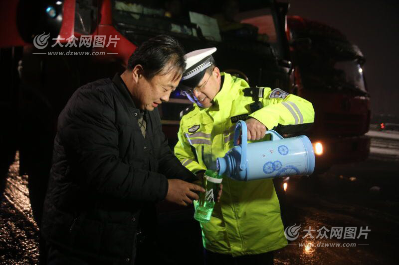 2月21日,22時(shí)15,菏澤高速交警一大隊(duì)民警在魯豫省界為進(jìn)入山東的駕駛?cè)颂峁崴?/p>
