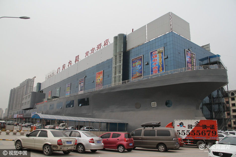 2017年2月21日,在山東濟南小清河東路上,一大樓外形酷似巨型“輪船”開上大街,吸引眾多路人的眼球。