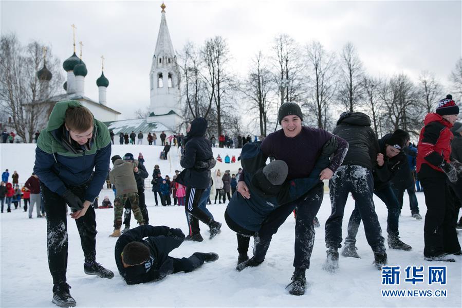 2月25日,在俄羅斯雅羅斯拉夫爾,人們在雪地里摔跤,慶!爸x肉節”。 “謝肉節”又稱送冬節,俄羅斯各地民眾在節日期間載歌載舞,做游戲、吃薄餅、燒稻草人,迎接春天的到來。 新華社記者白雪騏攝