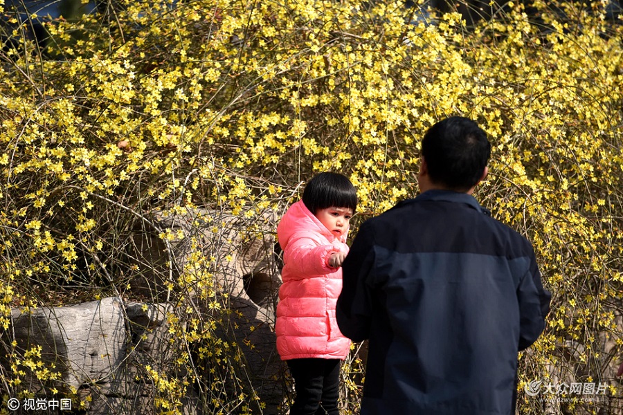 2017年02月26日,山東省濟南市,明湖畔,一簇簇迎春花迎著暖陽已經悄然綻放,釋放出春天的氣息。周末前來踏青賞花的市民游客紛紛掏出手機拍照。前幾日還寒風刺骨的濟南,仿佛一轉眼就變成了溫暖的春天,有點讓人難以適應。