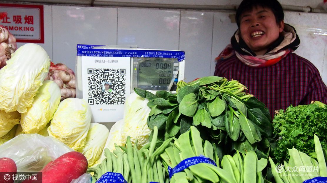 2017年3月1日,濟南千佛山農貿市場生意興隆,數十位來自山東其他地市和農村的賣菜大媽,都在使用掃碼支付功能收款,每個人的攤子上不僅有微信支付,還有支付寶支付。