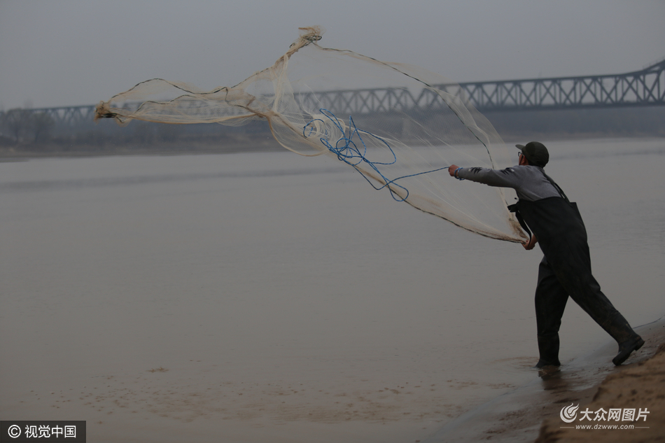 2017年2月28日,在濟(jì)南黃河濼口浮橋段,多名男子身穿連體防水服,帶著漁具站在齊腰深的黃河中散網(wǎng)捕魚,并將捕上來的魚帶到黃河大壩岸上路邊叫賣。