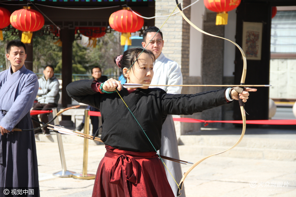 2017年3月7日,在山東濟南百花洲,10余人著古裝上演真實版彎弓射箭,還原傳統射圃,吸引眾多路人圍觀。身著古裝表演傳統射圃,精準射術令現場觀眾驚嘆。