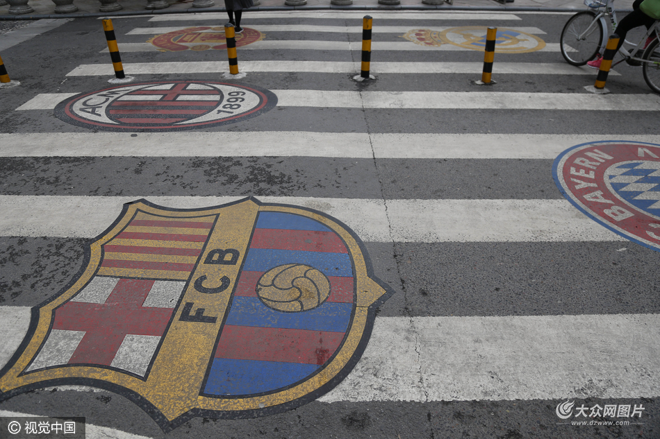 在每處斑馬線上,都零散繪制著五六個徽標圖案,每個圖案直徑有一米多,鮮艷的彩色涂料分外吸睛。路邊一處小店的店主稱,并不清楚這些圖案是誰繪制的,但給黑色的柏油路面增色不少。也有人調侃,這些標志讓車迷、球迷都能夠“眼前一亮”。