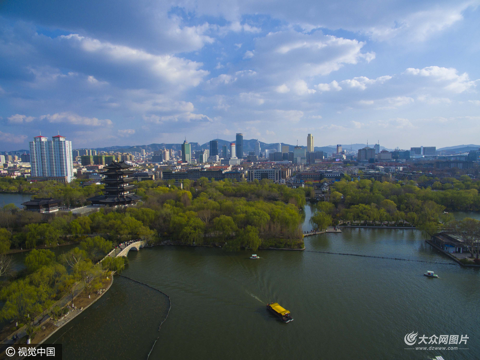 2017年03月26日,山東省濟南市,航拍雨后大明湖再現藍天白云好氣質,春光暖陽中,湖面碧波蕩舟;滿目青翠,庭院小橋,宛如一幅春色浸染畫作。