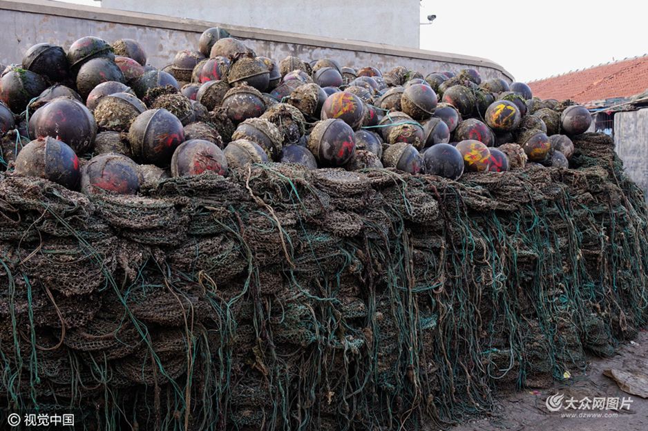 3月30日早晨,青島西海岸大灣漁港碼頭上堆滿(mǎn)了用來(lái)養(yǎng)殖扇貝的網(wǎng)籠和浮球。
