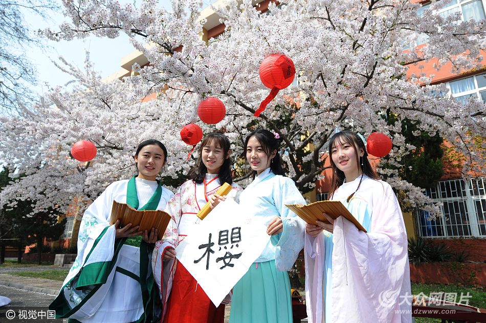 2017年4月6日,山東省青島市,青島科技大學高分子學院櫻花盛開,大學生們以弘揚傳統文化為主題,穿漢服展才藝,在櫻花樹下演繹了一場最具傳統色彩的文化盛宴。
