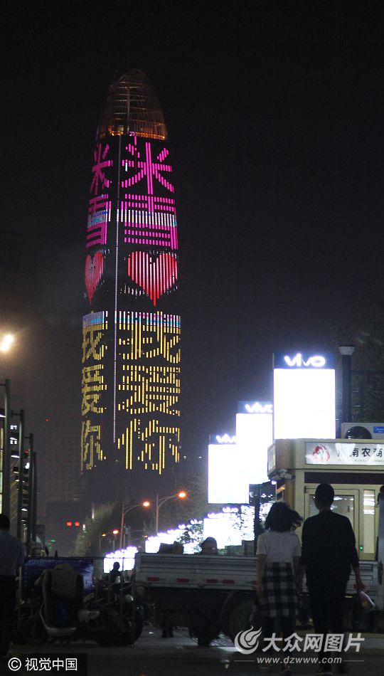 2017年4月14日,濟南最高樓點亮“米雪我愛你,米雪嫁給我”等巨型字幕,吸引眾多路人抬頭觀望這一爛漫的瞬間。