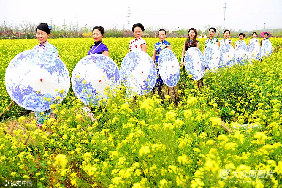 2017年4月21日,山東青島西海岸生態觀光園,旗袍愛好者在盛開的油菜花海中進行旗袍走秀。