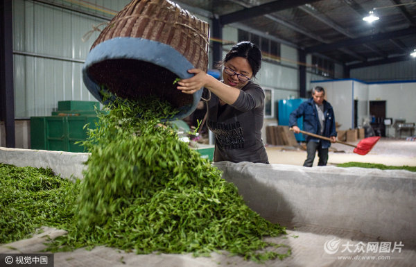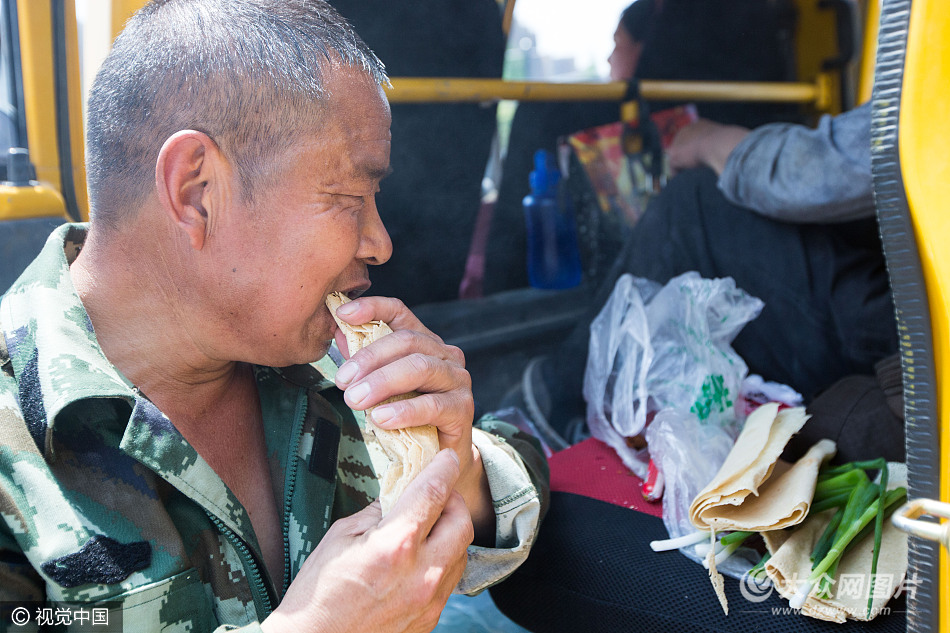 2017年4月15日,在杭州一條馬路上,來自山東臨沂的幾位農民工正在吃自己的午餐。春節一過他們就出來打工了,每人各帶了60斤的山東煎餅。煎餅2元一斤,既便宜又方便攜帶,出來打工天天午餐都吃,夠吃四個月。