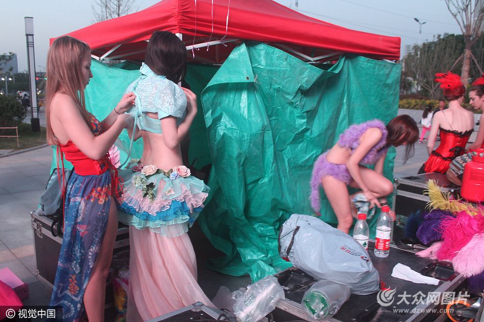 2017年4月29日,山東濱州,在一場維密走秀表演開始前,洋模們擠在一個空間不大的換衣間里脫掉便裝,換上維密裝扮。