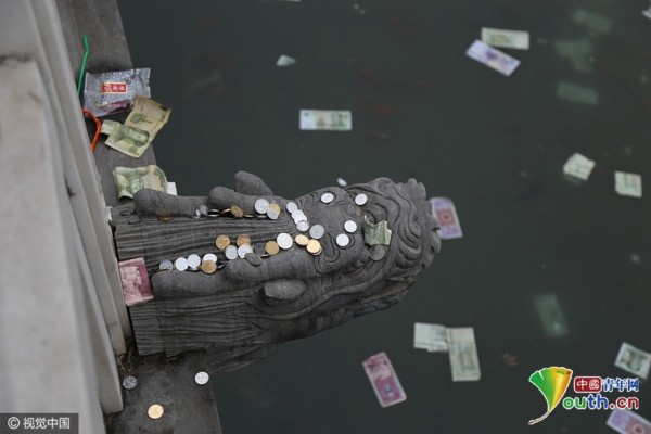 2017年1月28日,河南鄭州,鄭州文廟在大年初一正常開放,不少市民前來燒香請愿,而文廟門前的泮池(半月形水池)內卻被扔滿了各類紙幣、硬幣,游客還在水池邊龍首形出水口上堆滿人民幣,有人調侃“水池里的金魚都驚呆了”。