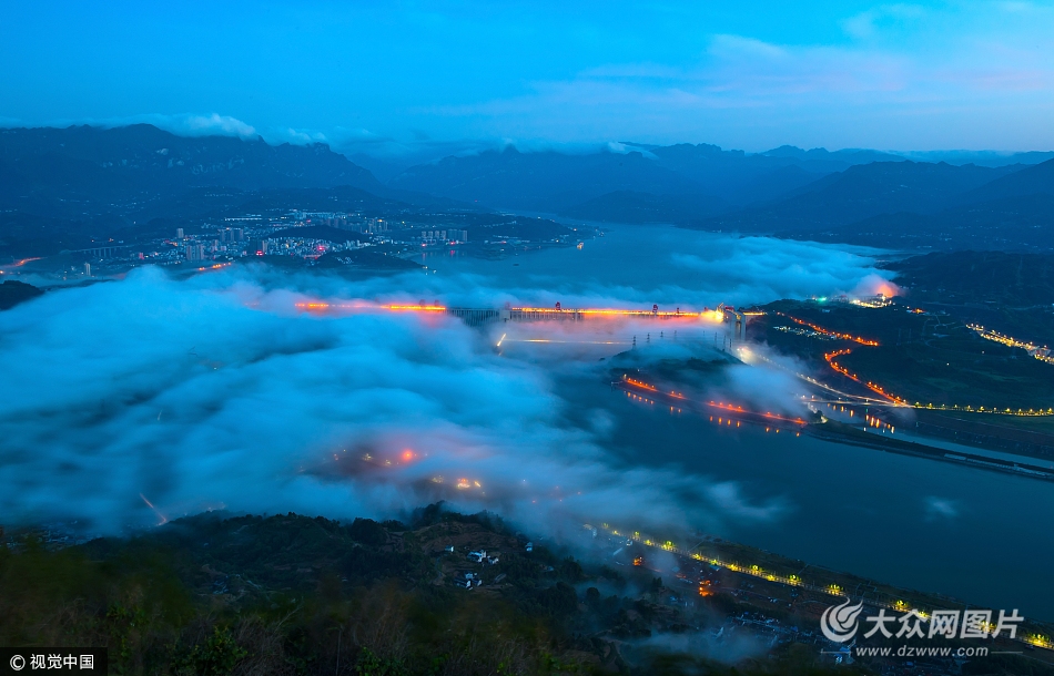 2017年5月12日,湖北宜昌,雨過天晴,三峽工程晨霧繚繞,雄偉的大壩在云霧中若隱若現,呈現出美侖美奐的動人景象。時下,三峽水庫正處于消落期。