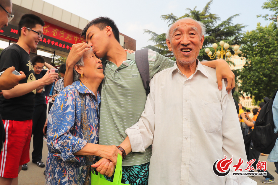 6月8日下午,2017年全國普通高考最后一科考試結(jié)束,在山東省實驗中學考點外,考生們陸續(xù)走出考場,家長和考生紛紛在考點外歡呼擁抱、拍照留念,慶祝高考結(jié)束。圖為一考生走出考場后親吻自己的奶奶,慶祝高考結(jié)束。大眾網(wǎng)記者 王長坤 攝