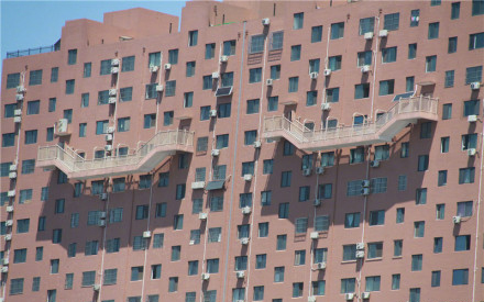 這4個空中樓梯,兩兩同層,位于6號樓13-14層、21-22層,分別連接一二單元,三四單元。從13層樓梯處往下看,至少有50米的高度,樓梯兩側設有1米左右的鐵柵欄。據6號樓的業主李先生介紹,6號樓共24層,有4個單元,每個單元只有一個電梯,如果發生火災等意外事故,僅靠電梯,可能來不及逃生,所以建了這4個安全通道,“如果一側的電梯發生火災或者壞了,可以通過高空樓梯走到另一個單元,坐那邊的電梯,能及時疏散。”