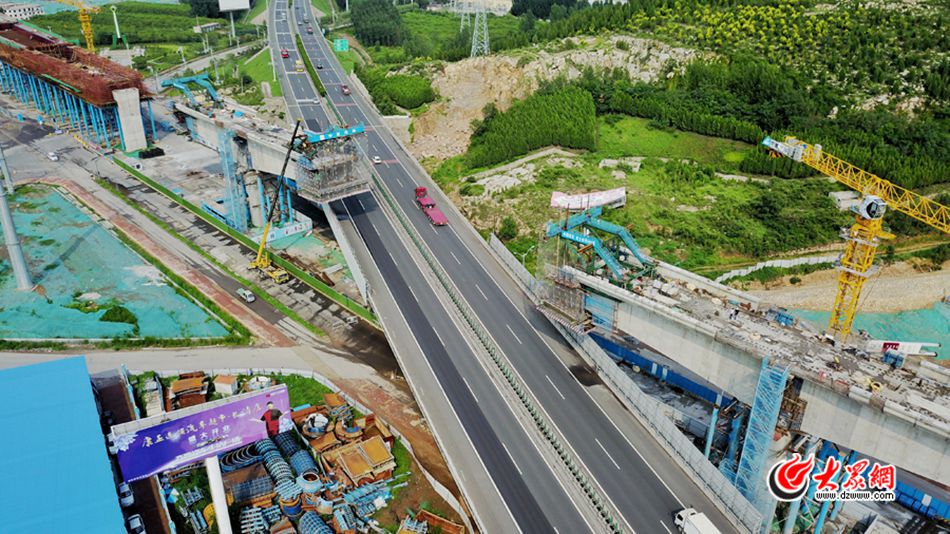 7月19日,在平安南路與劉長山路延長線交叉路口處,大眾網記者看到,R1線高架段已經有一小部分“爬”上了濟廣高速的上方,接下來它將一步步懸空跨過濟廣高速,最終在今年10月底在高速橋中心上方合攏。這也意味著高架段主體完工,16.2公里的“銀色長龍”騰空而起,蜿蜒于青山綠水間。(大眾網-山東24小時客戶端記者 王長坤 攝)