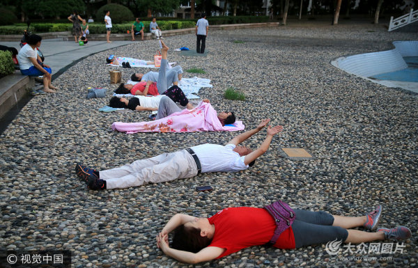 大叔大媽躺鵝卵石地面做“熱療” 稱是冬病夏治