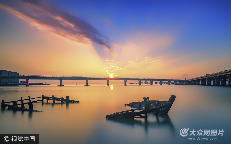 日落時(shí)分,在膠州灣大橋的南側(cè)欣賞夕陽之下的大橋建筑弧度,美不勝收。