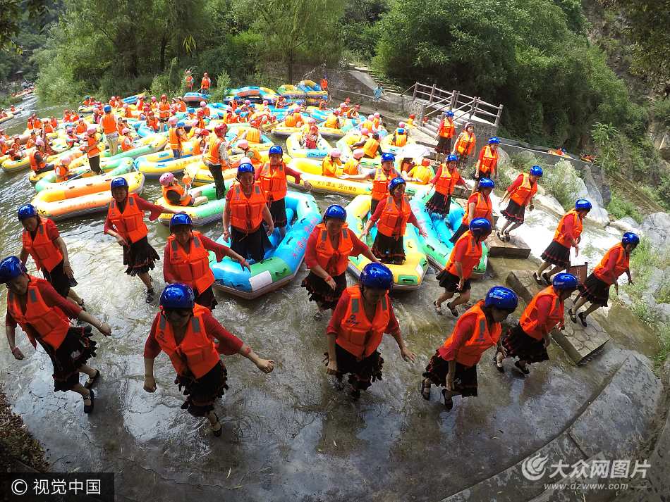 2017年8月16日,秋老虎發威高溫難耐,河南盧氏豫西大峽谷漂流游客有增無減,漂流河道堵成長龍,大媽們把皮筏艇拉到淺灘,開始激情四射的水中跳起廣場舞,還有人現場放音樂。大媽們身穿黑色短裙踩著音律的節奏、扭動著濕漉漉身軀翩翩起舞,動作整齊劃一,似出水芙蓉。
