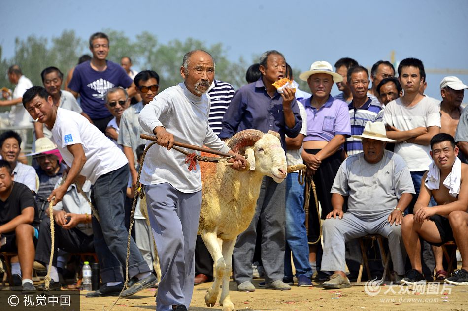 2017年9月12日,山東聊城,在陽(yáng)谷縣李臺(tái)鎮(zhèn)四連村第十六屆斗羊大賽”活動(dòng)現(xiàn)場(chǎng),村民們?cè)谟^看斗羊比賽。當(dāng)日,山東省陽(yáng)谷縣李臺(tái)鎮(zhèn)第十六屆斗羊大賽在四連村文化廣場(chǎng)舉行,來(lái)自該縣及聊城、莘縣、單縣、慶豐、鄄城、梁山等20多個(gè)縣市的養(yǎng)殖戶帶著200余只抵羊參賽,觀眾達(dá)2000余人。比賽根據(jù)不同羊齡分別設(shè)一、二、三等獎(jiǎng)和冠、亞軍。陽(yáng)谷縣在每年的重大節(jié)日和國(guó)家重大活動(dòng)期間,都要組織大規(guī)模的斗羊大賽。斗羊大賽不僅愉悅觀眾,還是優(yōu)良品種交流、展示和推介的平臺(tái),調(diào)動(dòng)了農(nóng)民養(yǎng)羊的積極性,抵羊大賽是群眾喜聞樂(lè)見(jiàn)的文化體育活動(dòng)。