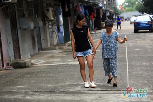 9月11日,在離南昌理工學院不遠的金牛小區,該學院的學生趙金鳳攙扶著偏癱的母親在散步。