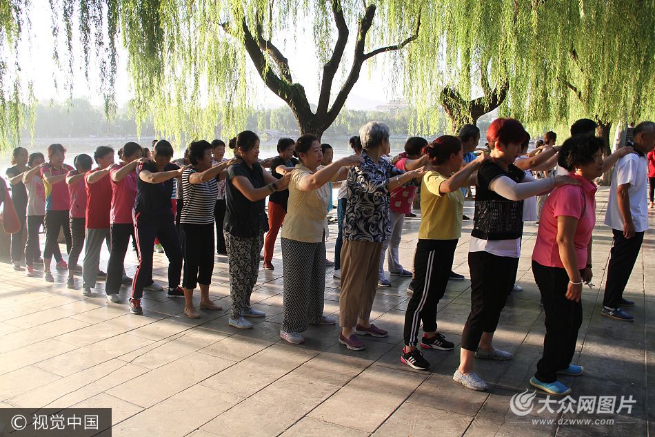 2017年9月20日清晨,在濟南大明湖景區內,數百大爺大媽互相拍打肩膀跳操,幽默滑稽的體育動作,逗笑不少過往游客。