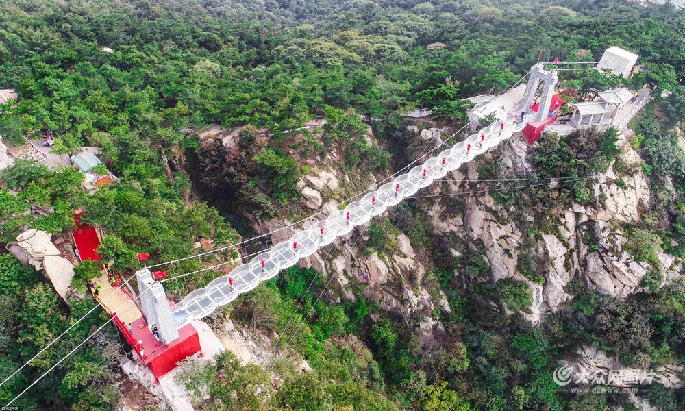 國慶節前夕,山東臨沂沂蒙山龜蒙景區160米長的3D玻璃橋投入使用。據了解,這座橋建設在海拔1000多米的蒙山山峰上,由鋼繩及數百塊全透明鋼化玻璃構造而成,橋兩端設計3D地貼畫面。游客走在橋上好似行在空中,驚險刺激。