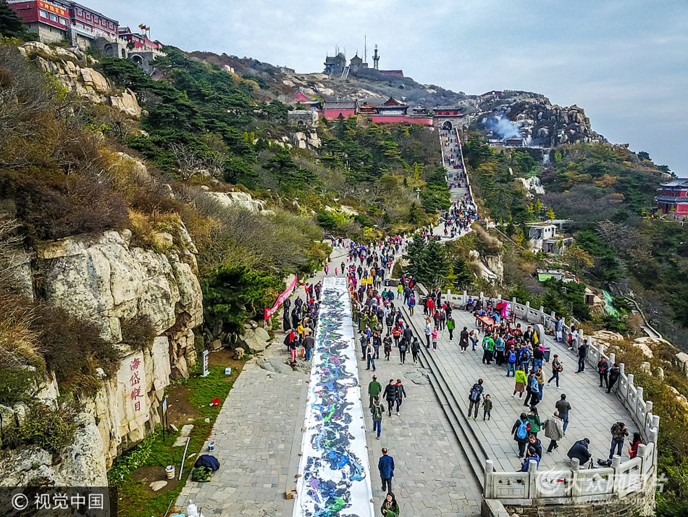 2017年10月14日,在泰山之巔天街上,袁海龍等齊魯名家運用潑墨、點染、勾勒等技巧,現場一同繪制了長達56米的巨幅山水長卷《大美泰山》,令游人大飽眼福。