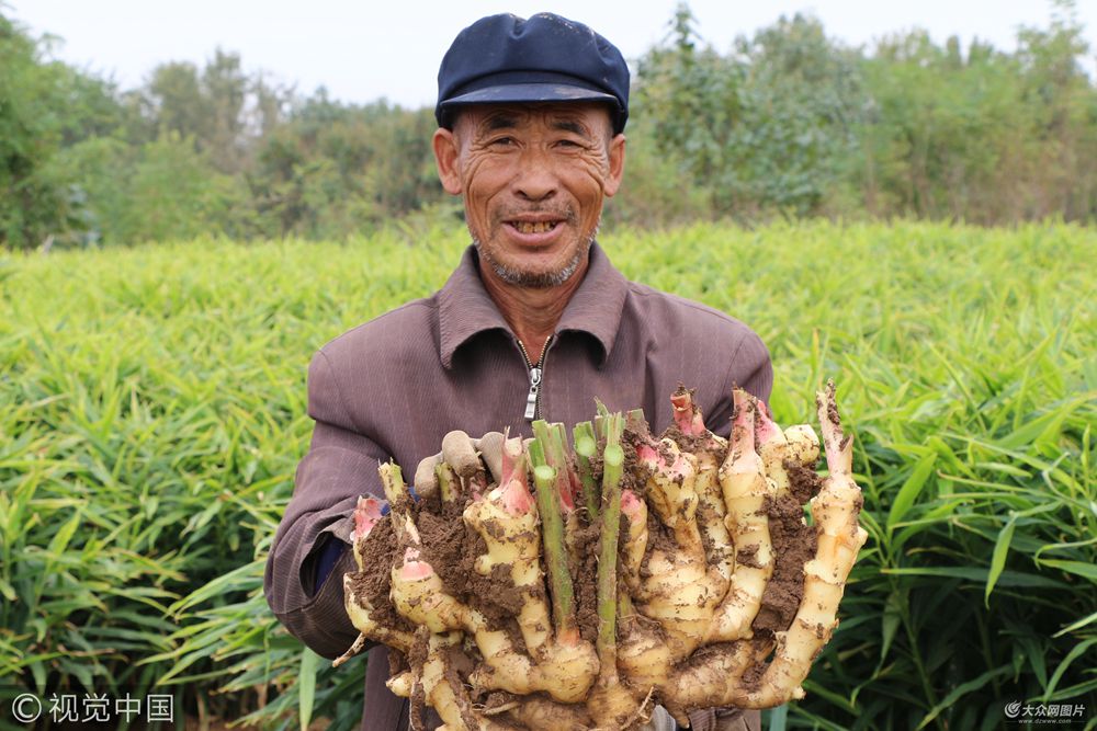 2017年10月18日,山東濰坊安丘市輝渠鎮李家河村的農戶正在收獲大姜。11.6斤的一塊姜在村里的姜王評比中,拔得頭籌。山東安丘是中國知名的“‘蒜姜之鄉’”,這里的農戶靠種植大姜過上了好日子。