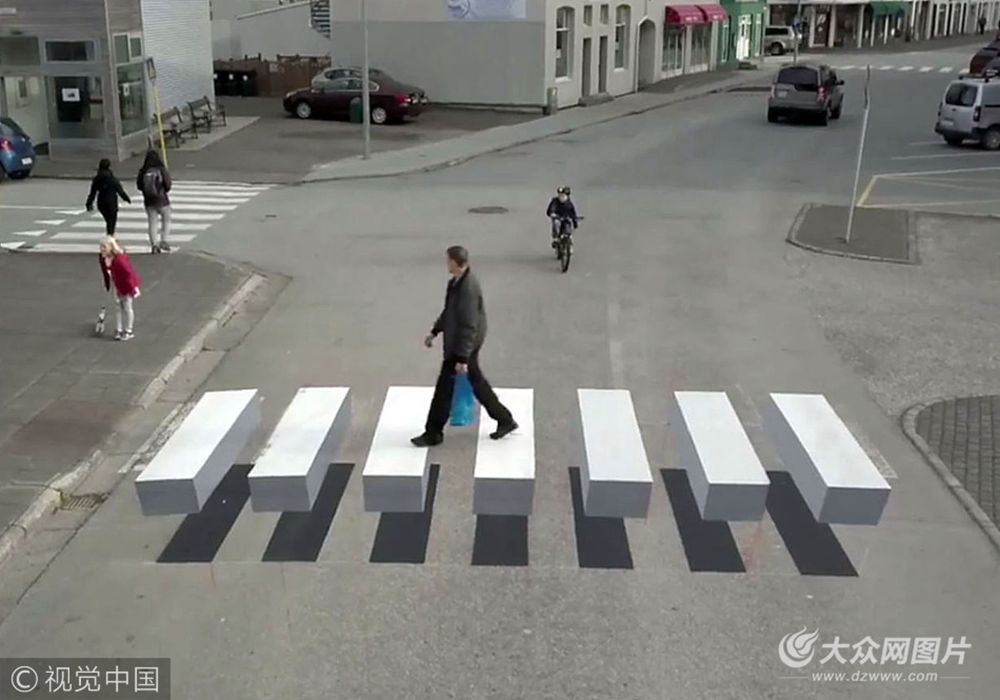 當(dāng)?shù)貢r間2017年9月26日,冰島伊薩菲厄澤,在冰島的一個小鎮(zhèn)上,出現(xiàn)了這種令人難以接受的十字路口。這種給人以漂浮感覺的“3D斑馬線”是為了提醒過往司機(jī)注意減速,如果測試結(jié)果該方法確實(shí)對于減緩車速有效,將有跟多的3D斑馬線運(yùn)用在城鎮(zhèn)的到路口。