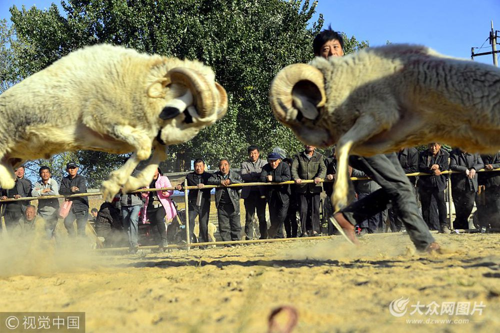 2017年10月30日,聊城陽谷縣僑潤街道城角徐村抵羊大賽活動現場,村民在參加抵羊大賽。