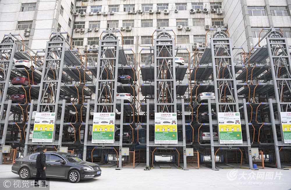 2017年10月31日,擁有120個吊籃式車位的立體車庫在濟南經四緯二附近投入使用,許多車主“嘗鮮”停車,看座駕“爬樓”。 張勇(山東分社)/中新社/視覺中國