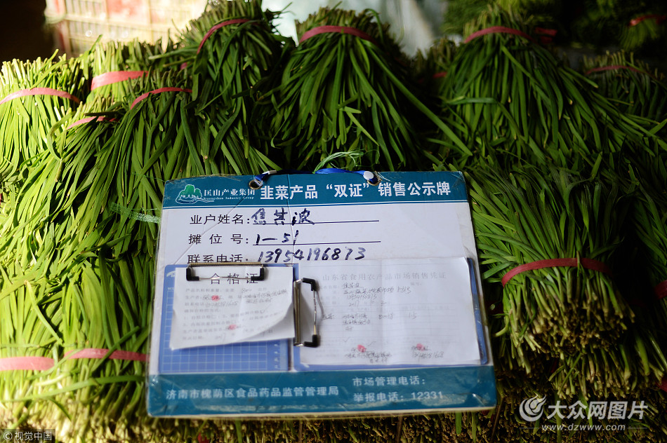 2017年10月31日,山東省濟南市,在濟齊路附近匡山蔬菜批發市場,數家批發韭菜的攤位前都懸掛上“韭菜產品雙證銷售公示牌”,張貼了“合格證”和“山東省食用農產品市場銷售憑證”,同時還注明了批發韭菜的業主姓名和聯系電話。從11月1日零時起,山東省全面啟動實施韭菜產品“雙證制”管理,嚴禁無《合格證》和《市場銷售憑證》的韭菜產品進入食用農產品市場、生產加工、餐飲服務環節。其中,在合格證中寫明了韭菜的產地和生產者姓名及電話,韭菜一旦出現問題,可以直接追溯到韭菜種植地源頭。