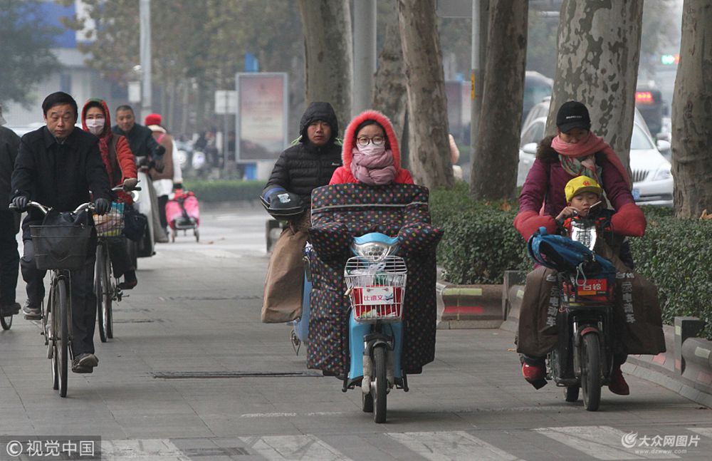2017年11月16日,在濟南泉城路上,市民出行全副武裝抵御寒潮的侵襲。據了解,受強冷空氣影響,今明兩天山東將出現大風和降溫天氣,多地氣溫直降10℃,最低溫降至-5℃。