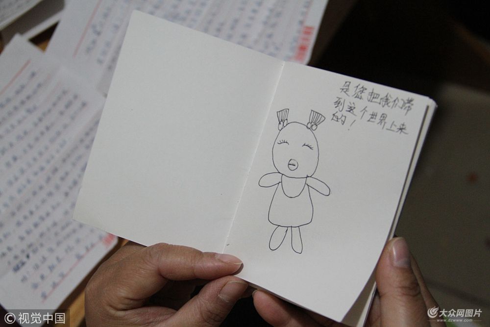 2017年11月27日,在濟南黃臺魏家莊城中村,一位家長展示自己孩子“對紙說話”的筆記本,令她十分感動。母親稱,為了養家糊口,不得不在外頭打零活,平時也沒有時間陪孩子一起,孩子在孤寂時用畫畫與寫字的方式來表達自己的情感。似乎對著白紙說話。