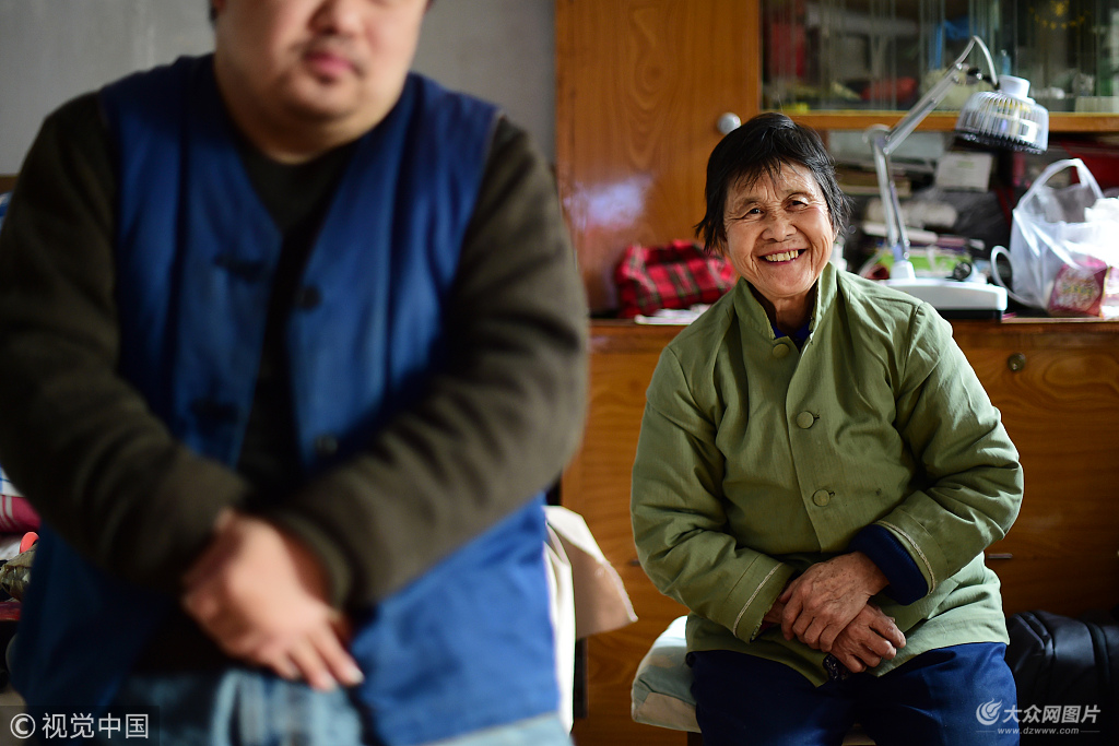 2017年12月13日,青島,趙忠璞今年73歲,來自山東青島膠州市。在本該安度晚年的年紀,這位老人卻仍在為兩個殘疾兒子忙碌著。老人的一生可謂艱辛,收養了一個盲童,傾盡家財給這個視力殘疾的兒子看病,后來又生了一個智力殘疾的二兒子,含辛茹苦將兩個病疾孩子養大。年輕的時候,她在建筑公司當過小工,做過統計員,還開過塔吊,退休以后,她又擺攤修鞋20年,貼補家用。