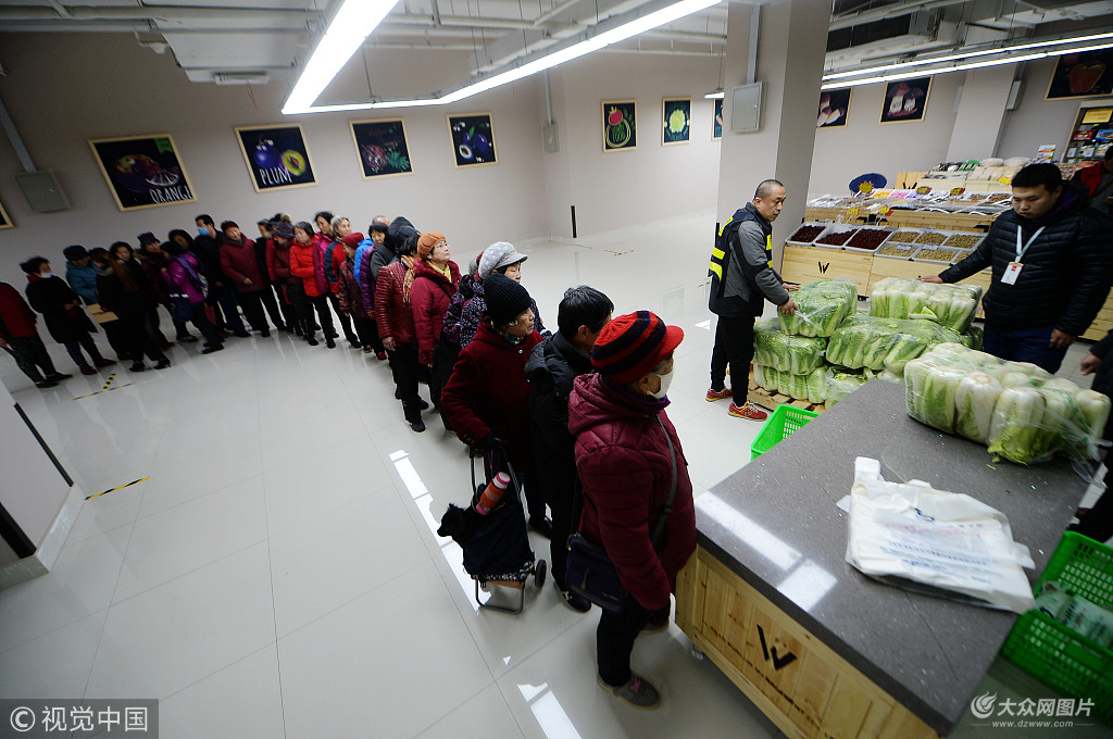 2017年12月16日,山東省濟(jì)南市,在緯十二路地下二層的人防商城,占地2000平方米的便民菜市場開始營業(yè),50多個營業(yè)攤位銷售新鮮的蔬菜、肉制品、海鮮、面食和水果,貨架全部統(tǒng)一樣式,商販全部統(tǒng)一著裝,市民可以一站式購買全各種果蔬副食。據(jù)了解,這是濟(jì)南首個利用地下人防商業(yè)街開設(shè)的菜市場,地下一層經(jīng)營各種時尚服飾和餐飲,地上一層與BRT站臺相同,市民購物買菜交通便利。為吸引更多市民前來購買蔬菜,商場每天分四個時段免費贈送白菜,全天贈送白菜1200多顆,總重達(dá)到5000多斤,吸引眾多老人前來領(lǐng)取,每人限領(lǐng)一顆,每顆白菜售價2元左右。