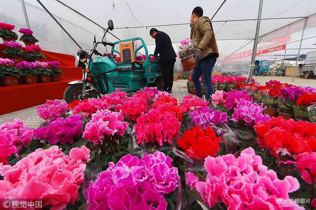 2017年12月29日,消費(fèi)者在山東濰坊青州市黃樓街道花農(nóng)聯(lián)合舉辦的年宵花展銷會(huì)上選購(gòu)花卉。