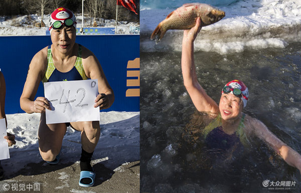 大媽零下42℃極寒冬泳 單手擒鯉魚