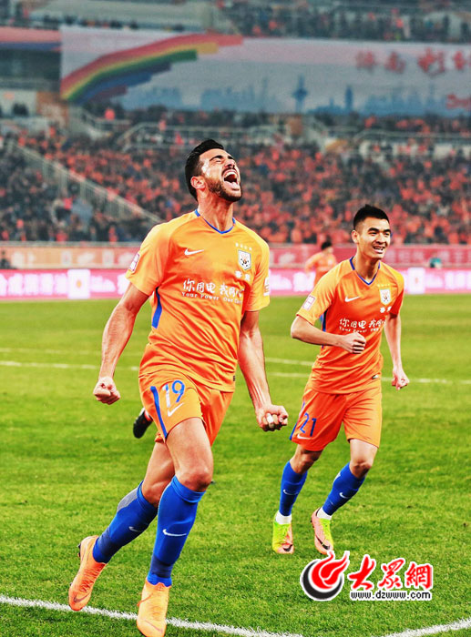 3月10日晚,中國足球超級聯賽第二輪繼續進行,山東魯能主場迎戰重慶斯威隊。塔爾德利打破僵局,劉彬彬助攻佩萊進球,最終魯能主場2-0戰勝重慶斯威,取得新賽季兩連勝。圖為佩萊進球后激情慶祝。大眾網記者王濤 攝