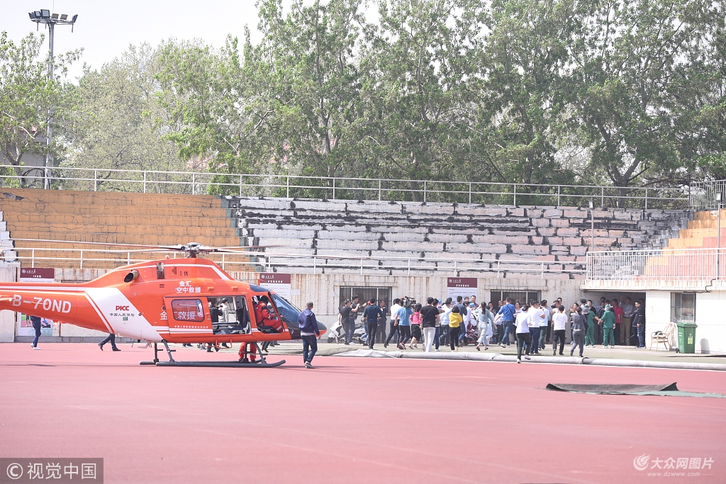 2018年4月2日,濟南,一架直升飛機降落山東濟南的山大趵突泉校區操場。據了解,當天上午,山東東營一位市民疑似草甘膦中毒急需轉到濟南的齊魯醫院救治。