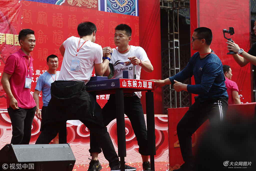 作為2018泰山東岳廟會的一部分,首屆中國泰山腕力王爭霸賽在泰山岱廟舉行,比賽吸引來近百位專業斗腕選手在腕力桌上奮力角逐,現場觀眾被緊張的賽事深深吸引。談起掰手腕,多數人的第一反應是“掰腕子”的民間運動,拼的是爆發力和手臂力量,而作為一項專業運動的腕力運動絕不是簡單的力量對決,腕力比的是心智,如何揣測對手的目的、破解對手的招數,才是取勝的關鍵。除此之外,腕力拼的不僅是手部力量,胸部、腹部、背部、腿部的肌肉也需要發力,正所謂“人臂合一”。腕力比賽與普通的“掰腕子”不同,腕力比賽中,雙方選手采用站立姿勢,分別站在腕力臺兩側,臺面上通常設有代表雙方不同顏色的墊板,比賽時選手的手肘不得離開墊板,此外還有發力時可以協助握持的金屬抓手,以及雙方的決勝墊,比賽以將對手拳頭頂部掰至碰觸到決勝墊為勝利。
