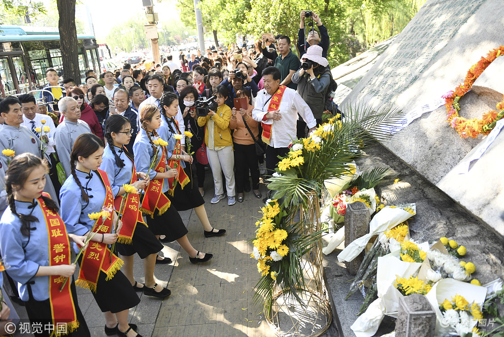 2018年5月3日,民眾向“五三慘案”紀念碑獻花,緬懷先烈。當日,濟南市社會各界人士在趵突泉畔的“五三慘案”紀念園舉行集會,悼念遭侵華日軍屠殺的中國外交官蔡公時烈士及同胞遇難90周年。據悉,1928年5月3日,日本以保護僑民為借口出兵侵占濟南,大肆屠殺中國外交官及軍民6123人,打傷軍民1700余人,制造了震驚中外的“濟南慘案”,又稱“五三慘案”。 張勇(山東分社)/中新社/視覺中國