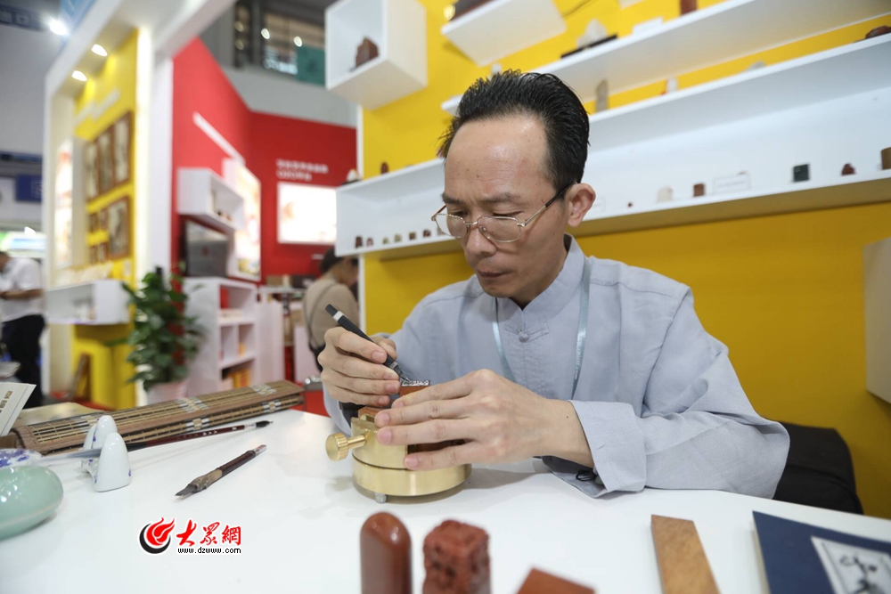 在曲阜印章展臺,孔府印閣的篆刻師張國亮現(xiàn)場展示傳統(tǒng)篆刻技藝。