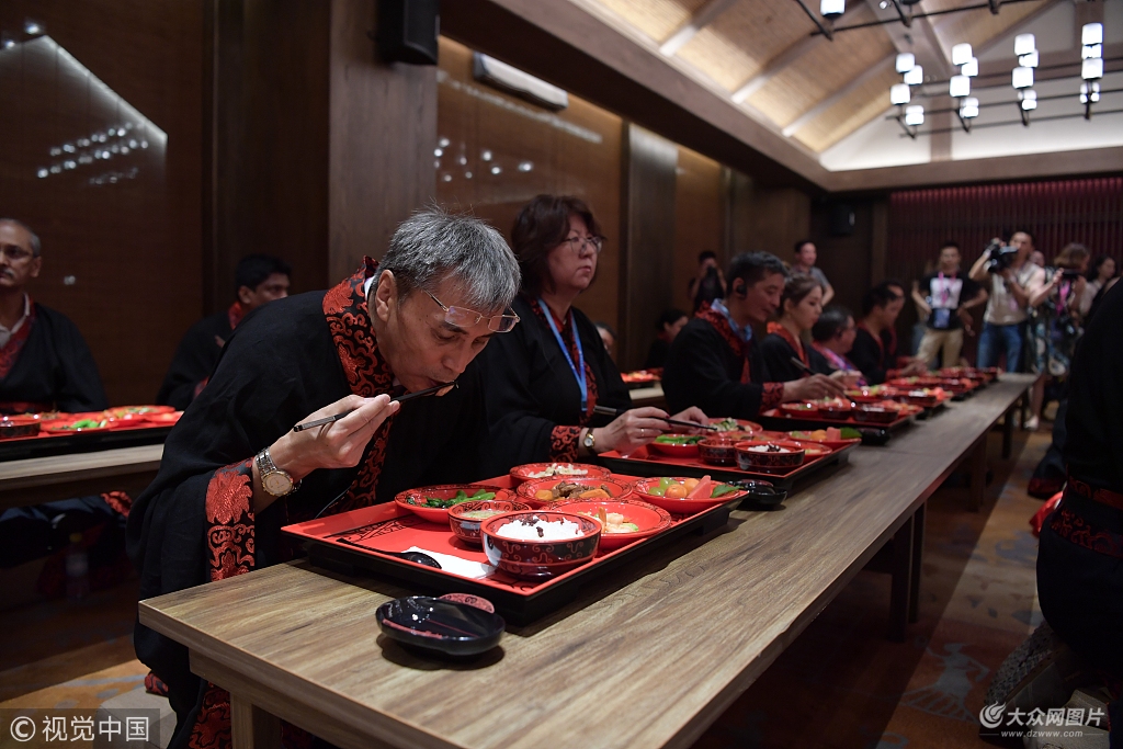 “迎賓,起樂——”隨著一位身著漢服的鳴贊官一聲高唱,來自印度、哈薩克斯坦、吉爾吉斯斯坦、巴基斯坦、俄羅斯、烏茲別克斯坦、阿富汗等14個國家43名新聞官員與主流媒體負責人,跟隨一名身著漢宮裝的侍女緩緩步入宴席,盤腿端坐,體驗中國古代“食禮”即“漢代定食食禮”。