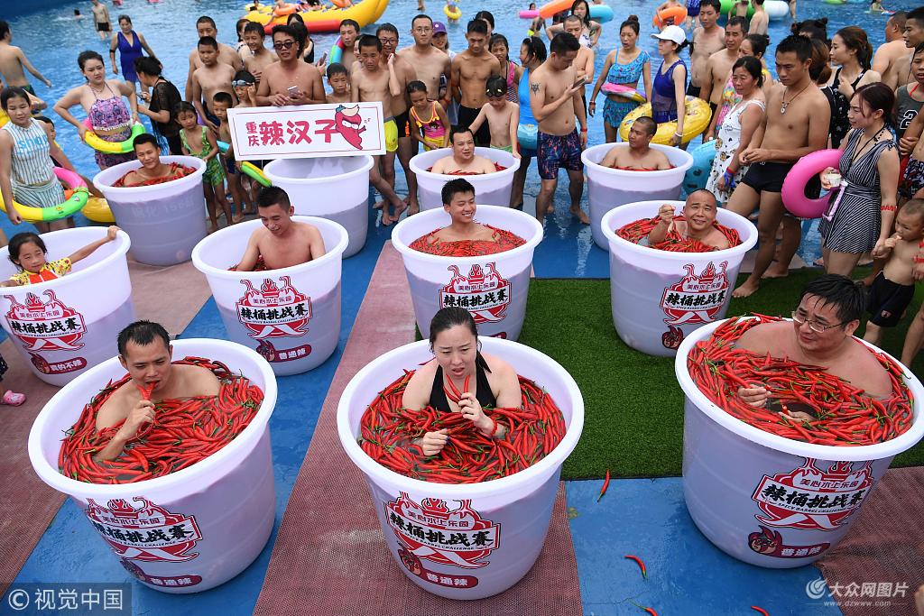 2018年7月7日,重慶涪陵紅酒小鎮水上樂園舉行辣桶挑戰賽,吸引了不少民眾在高溫天氣下體驗熱辣感覺。活動現場,大型塑料水桶內泡滿了各種類型的辣椒。游客如能堅持在辣椒水中浸泡5分鐘就能獲得活動主辦方送出的禮品。 陳超(重慶分社)/中新社/視覺中國