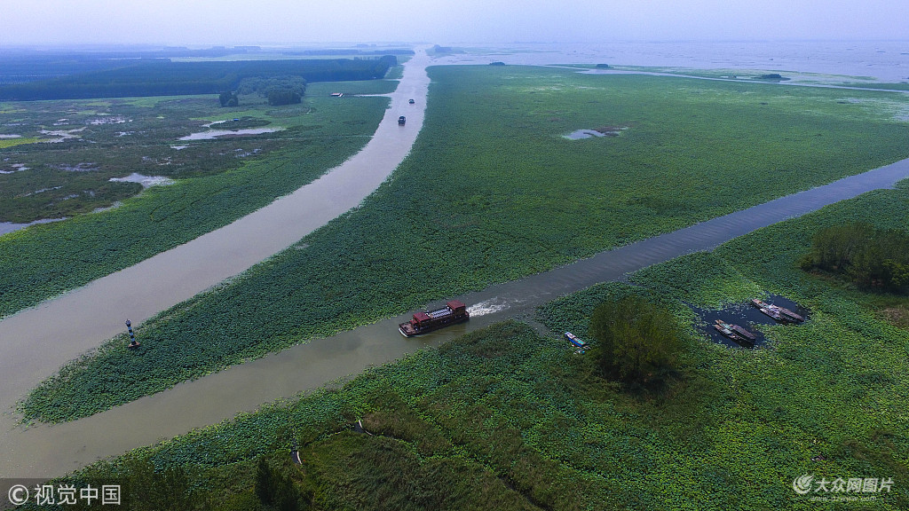 2018年7月28日,山東棗莊,游客乘坐游輪在滕州微山湖上觀光賞荷。