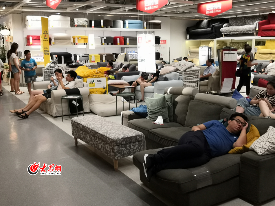 連日來濟南的最高氣溫都在35℃以上,圖為8月1日下午,宜家家居隨處可見或坐或臥的“蹭涼族”。